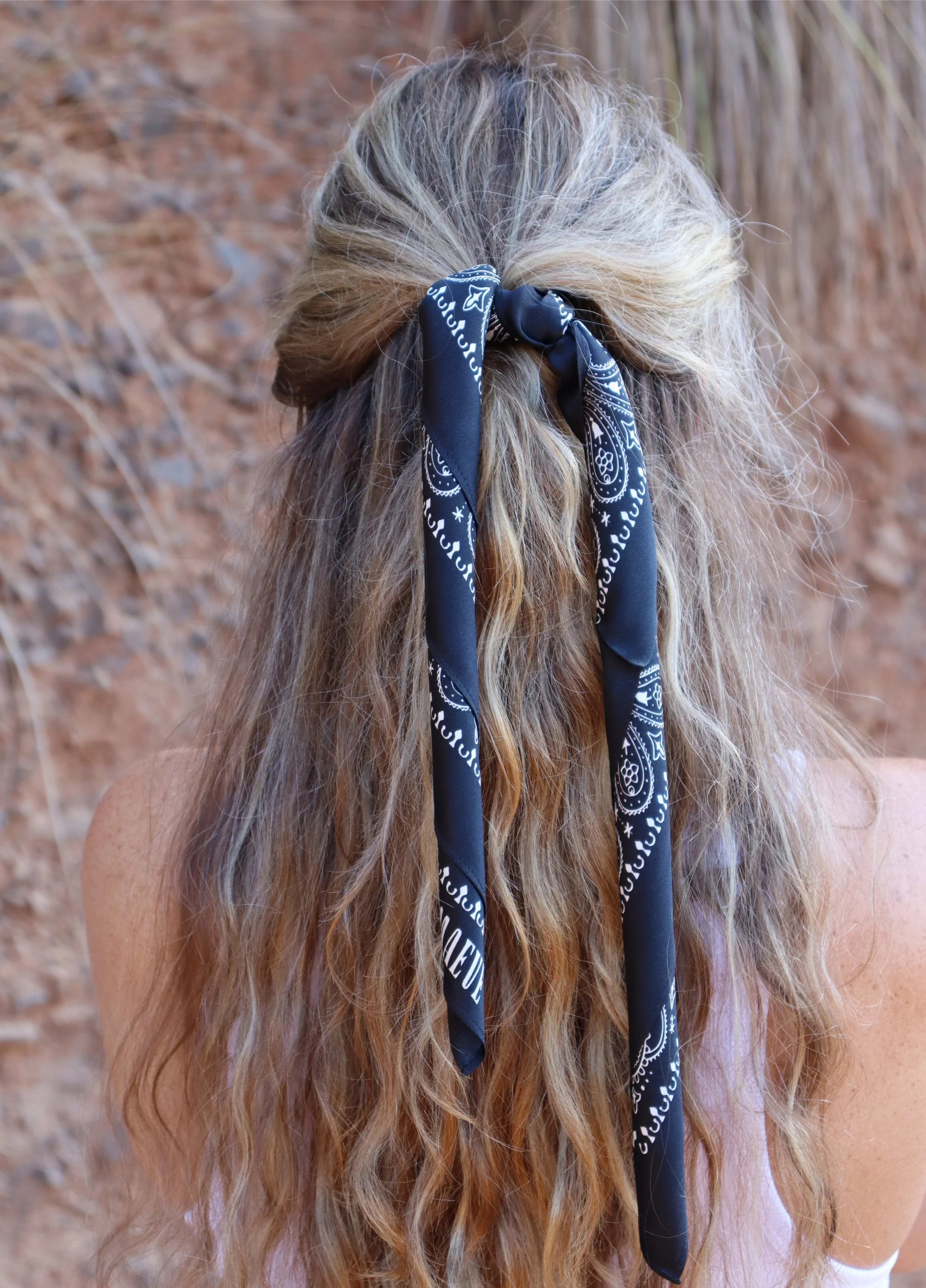 Whether it's in your hair, around your neck, tied up on your trousers or on a bag, the Paisley bandana in black it's a classic western accessory which can be worn every day, from a casual settings to a more formal and chic occasion. Maeve's bandanas, are double side printed and made with the best 100% Silk available to make it a life lasting piece.