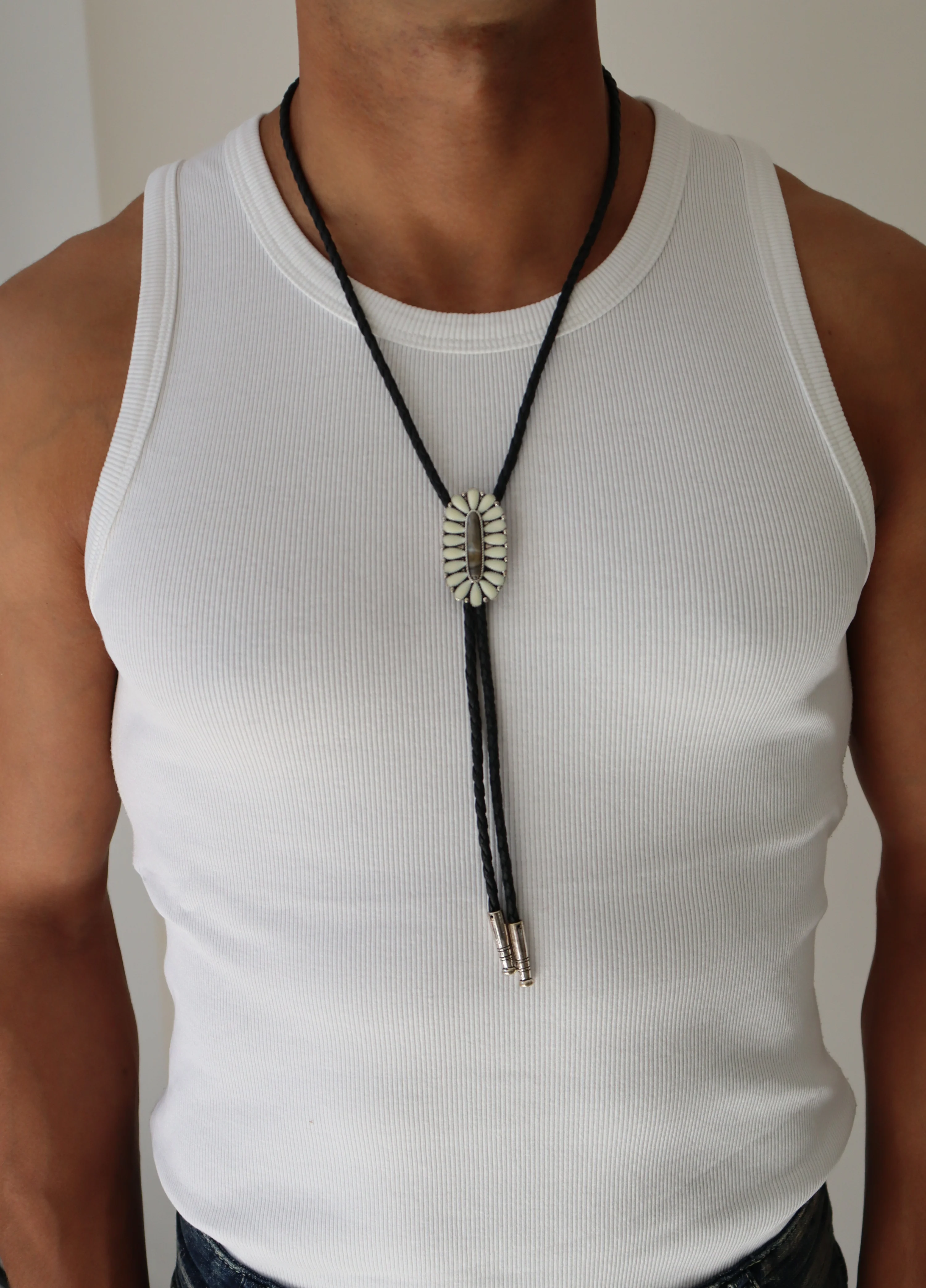 This pretty bolo tie features a stunning combination of white and silver details with a central natural stone, creating a truly unique and beautiful piece.