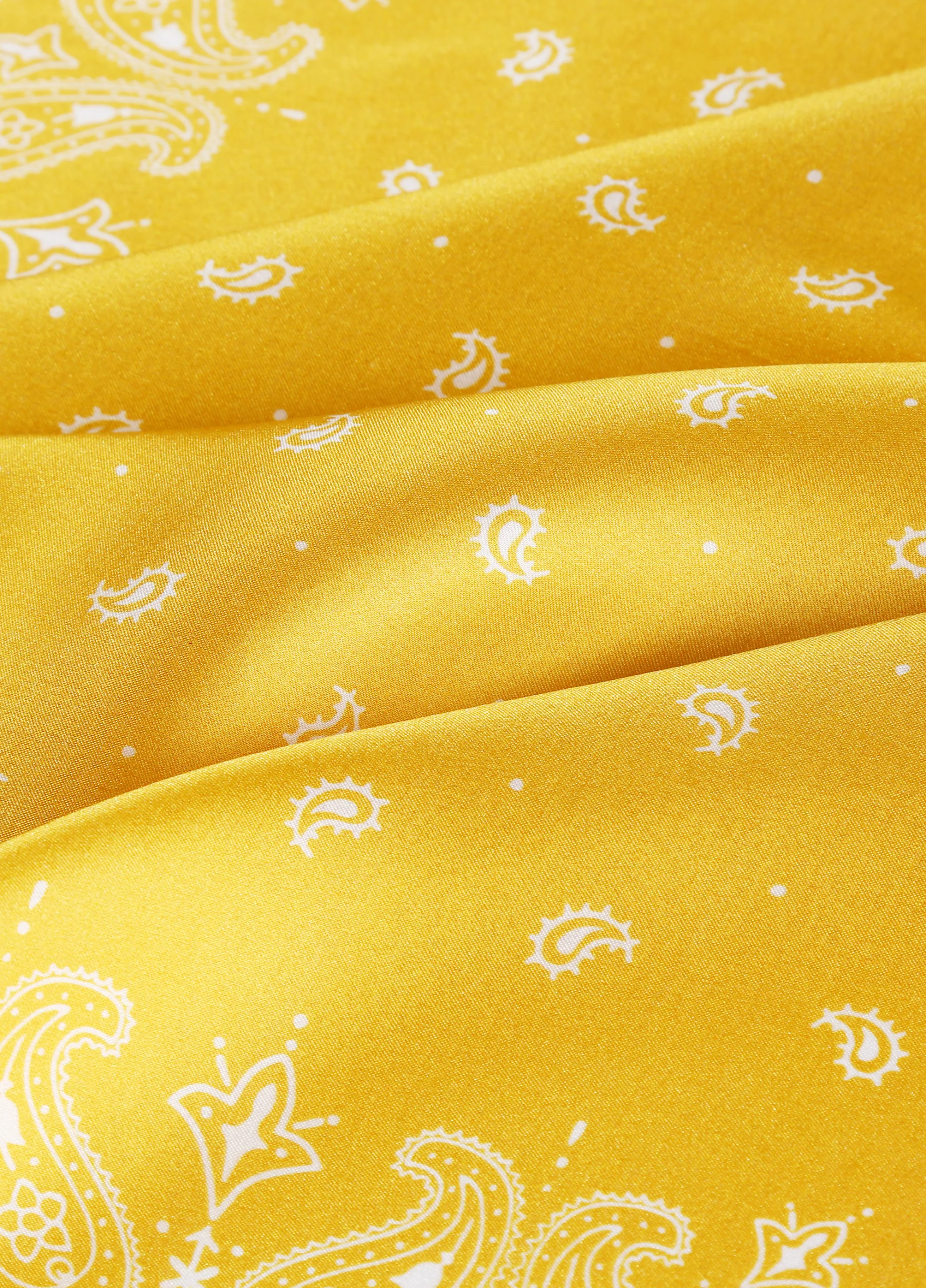 The Yellow Sand Bandana, a stylish accessory made with 100% pure silk. The unique vibrant yellow paisley design, printed on both sides, adds a touch of sophistication to any outfit.